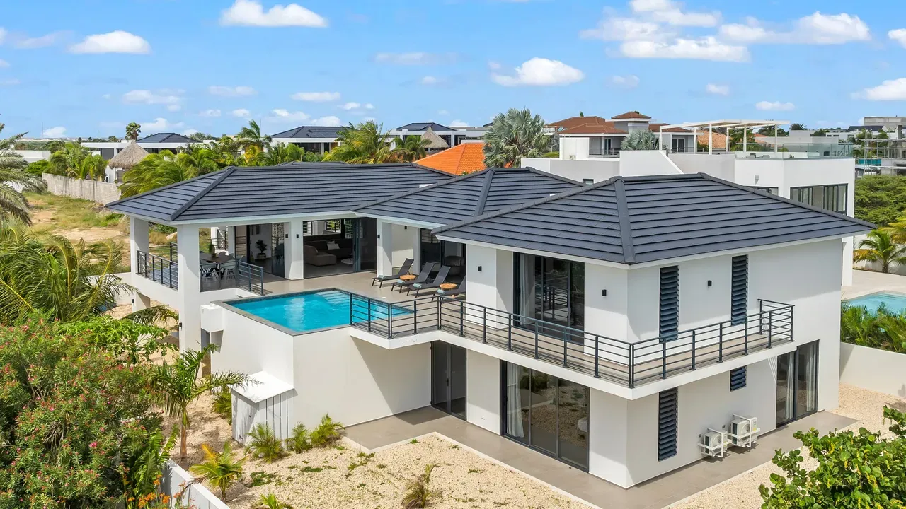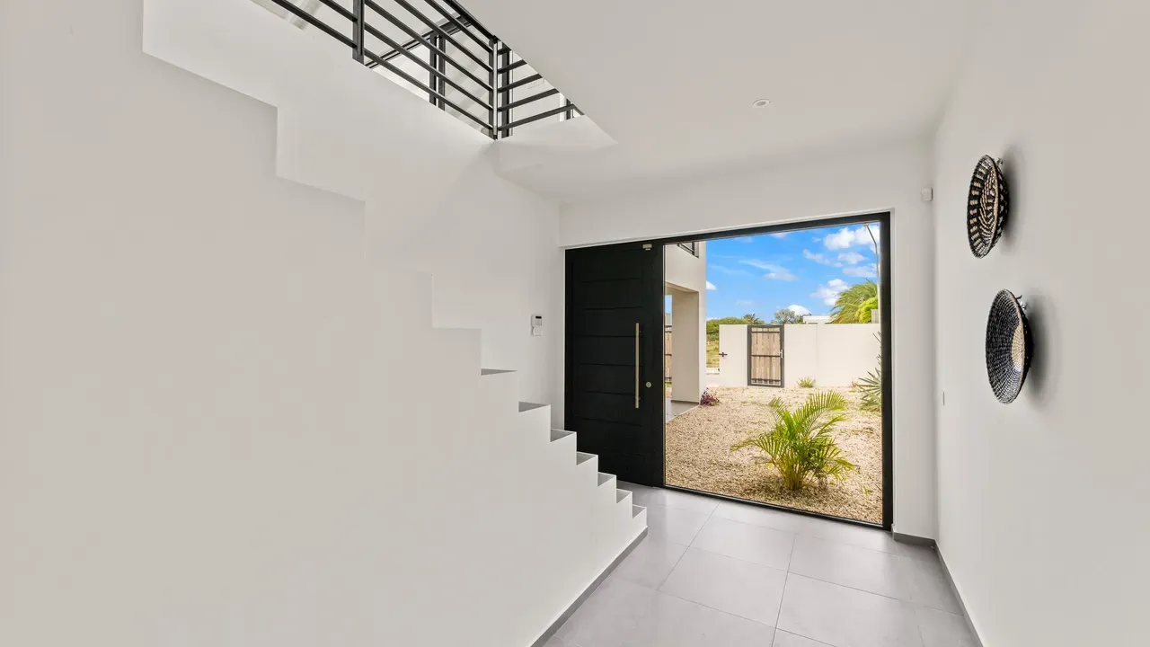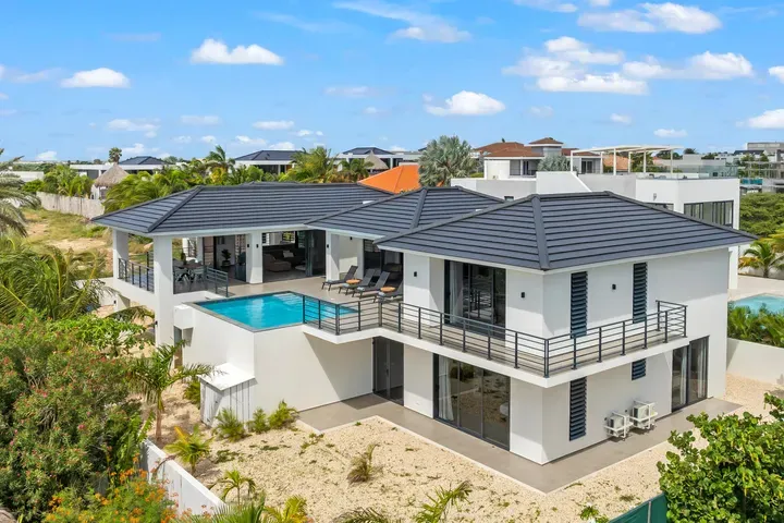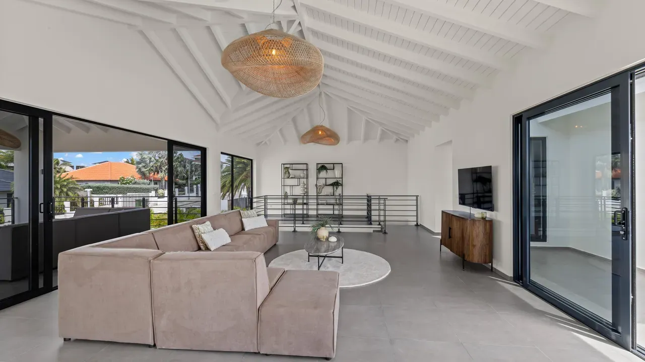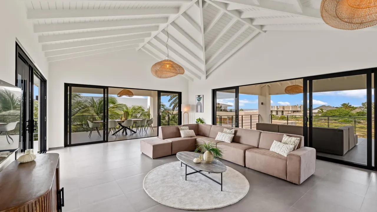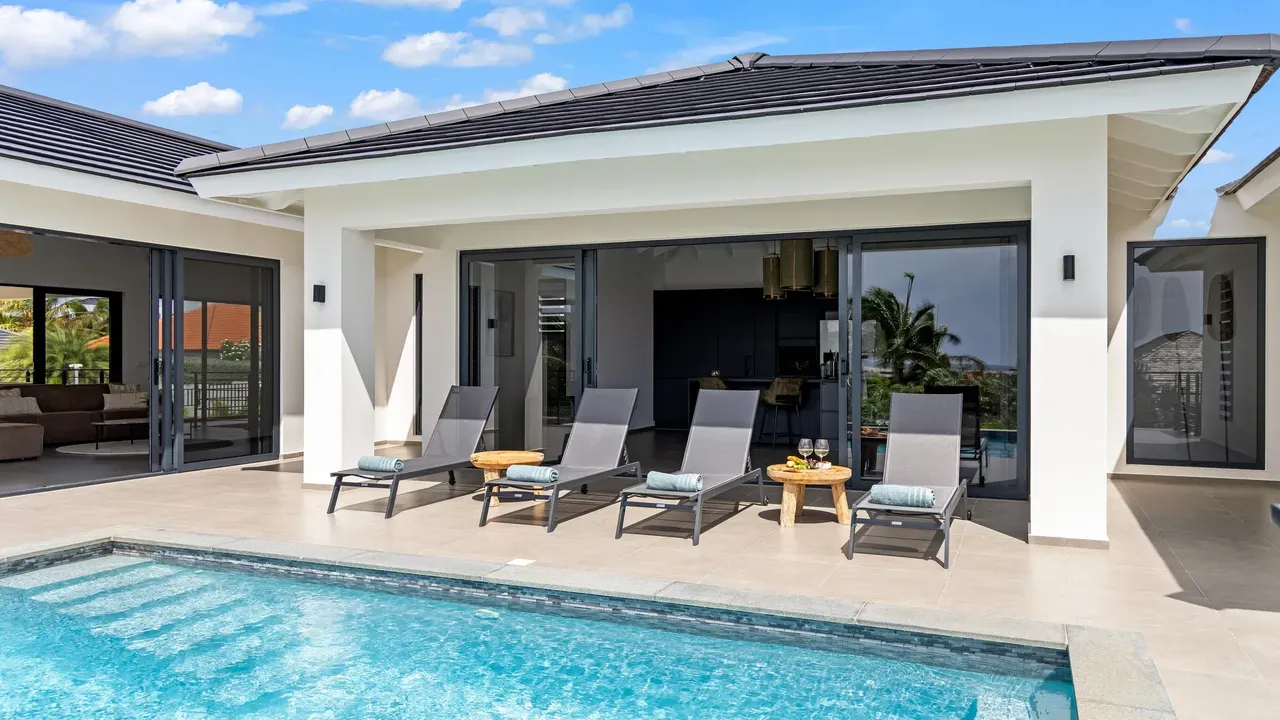 With exceptional precision and an impeccable sense of aesthetics, this villa in Vista Royal is celebrated as one of the most exquisitely designed masterpieces of today. The residence offers breathtaking views over the Caribbean Sea and the iconic Jan Thiel skyline. With this architectural triumph, Colombian architect Diego Hanao once again showcases his unparalleled signature style. Nestled along a quiet, distinguished street, the villa is crafted with materials of the highest caliber and adorned with bespoke finishes. The impressive tropical hardwood roof structure and expansive glass sliding doors bathe the interiors in natural light, creating an airy ambiance that seamlessly merges indoor and outdoor living. The villa features four bedrooms, including a lavish master suite, each accompanied by a luxuriously appointed en-suite bathroom and generous walk-in closets. The open floor plan flows effortlessly through the home's three primary spaces: the living area, the elegant gourmet kitchen, and the exclusive master suite. This harmonious layout is further enhanced by a grand chef’s kitchen equipped with premium appliances, a stunning infinity pool, an expansive entertainment area, a two-car indoor garage, and atmospheric LED lighting that beautifully accentuates the custom-designed balustrades. The garden has been designed and landscaped with meticulous care, forming a serene, lush oasis where exotic plantings and stately palms thrive in perfect harmony. Supported by an advanced automatic irrigation system, this verdant sanctuary remains in pristine condition throughout the year. This extraordinary villa has been conceived for the most discerning buyer—a rare fusion of design, craftsmanship, and location. We look forward to personally presenting this exceptional residential experience to you.