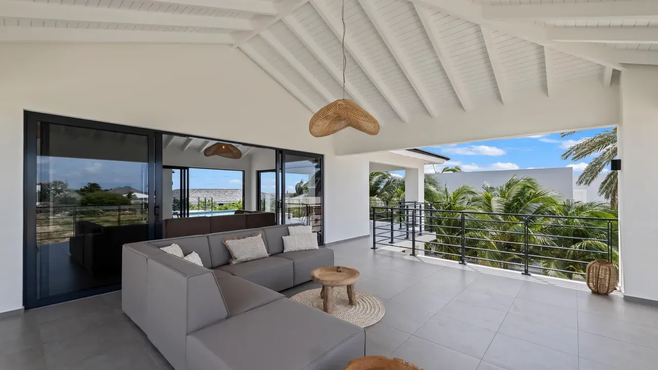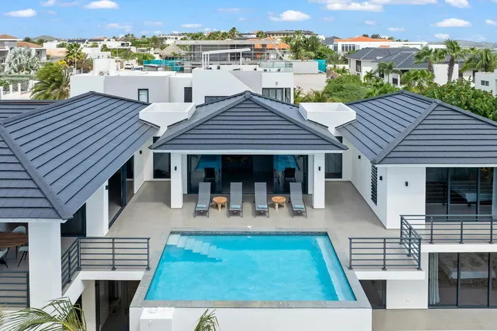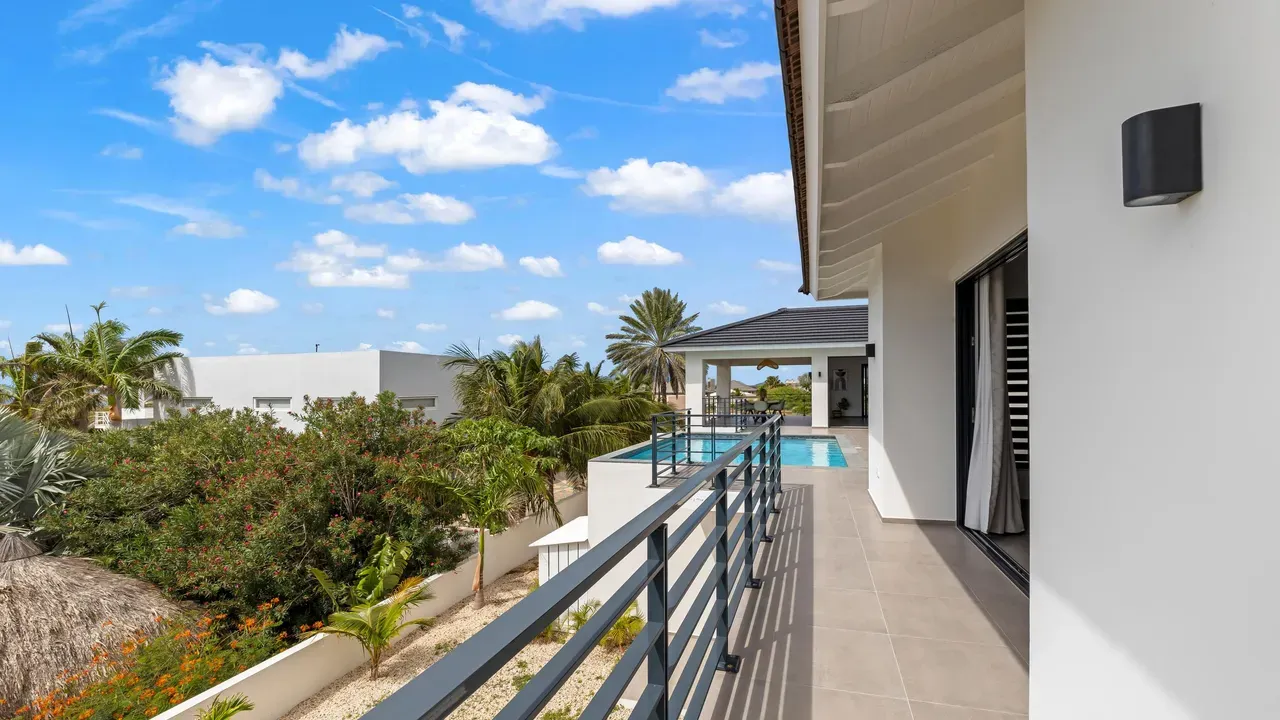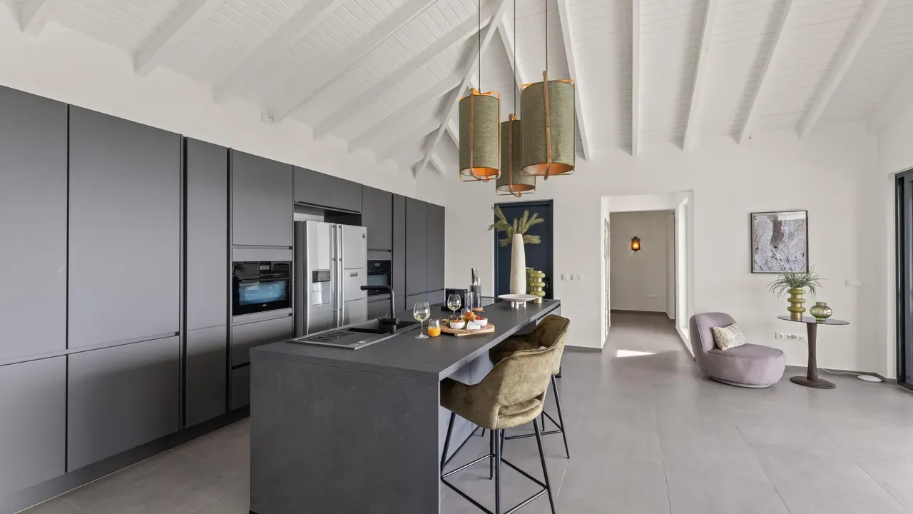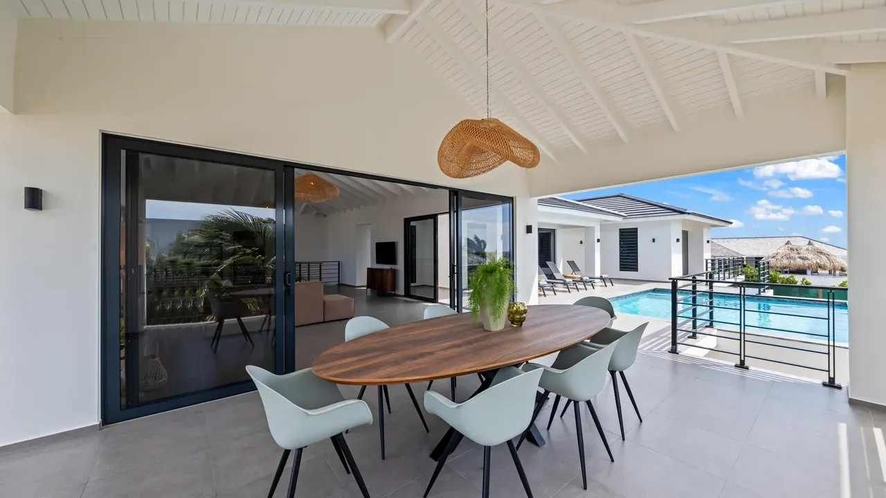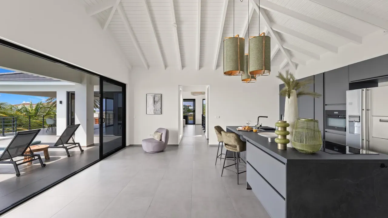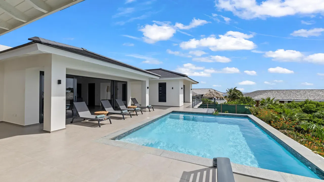 With exceptional precision and an impeccable sense of aesthetics, this villa in Vista Royal is celebrated as one of the most exquisitely designed masterpieces of today. The residence offers breathtaking views over the Caribbean Sea and the iconic Jan Thiel skyline. With this architectural triumph, Colombian architect Diego Hanao once again showcases his unparalleled signature style. Nestled along a quiet, distinguished street, the villa is crafted with materials of the highest caliber and adorned with bespoke finishes. The impressive tropical hardwood roof structure and expansive glass sliding doors bathe the interiors in natural light, creating an airy ambiance that seamlessly merges indoor and outdoor living. The villa features four bedrooms, including a lavish master suite, each accompanied by a luxuriously appointed en-suite bathroom and generous walk-in closets. The open floor plan flows effortlessly through the home's three primary spaces: the living area, the elegant gourmet kitchen, and the exclusive master suite. This harmonious layout is further enhanced by a grand chef’s kitchen equipped with premium appliances, a stunning infinity pool, an expansive entertainment area, a two-car indoor garage, and atmospheric LED lighting that beautifully accentuates the custom-designed balustrades. The garden has been designed and landscaped with meticulous care, forming a serene, lush oasis where exotic plantings and stately palms thrive in perfect harmony. Supported by an advanced automatic irrigation system, this verdant sanctuary remains in pristine condition throughout the year. This extraordinary villa has been conceived for the most discerning buyer—a rare fusion of design, craftsmanship, and location. We look forward to personally presenting this exceptional residential experience to you.