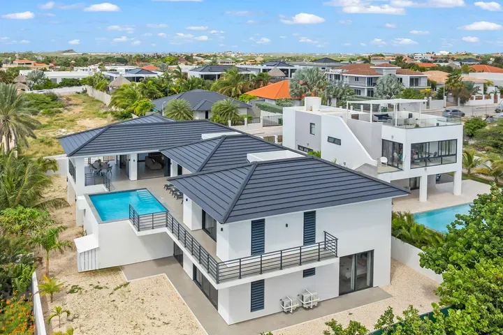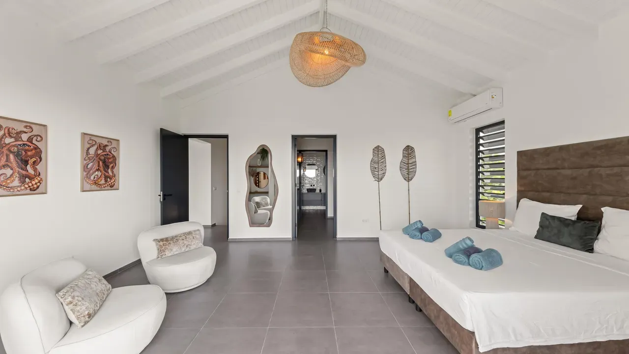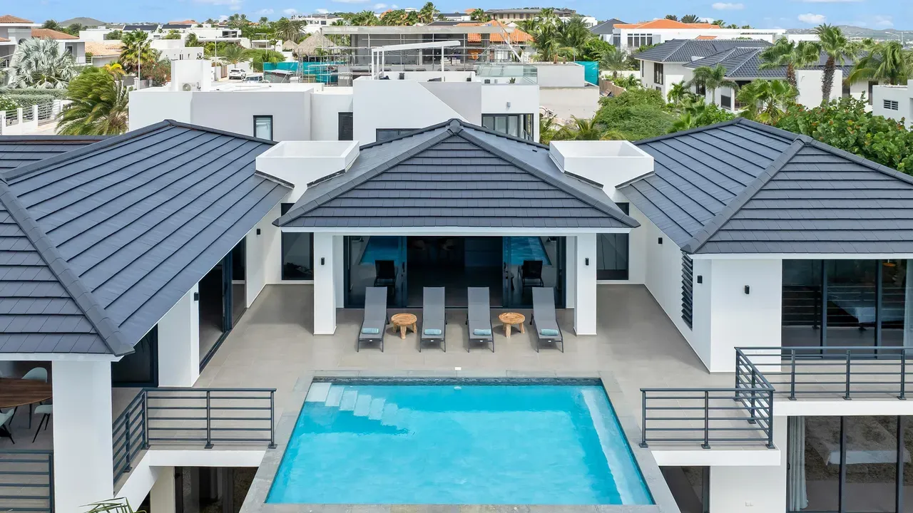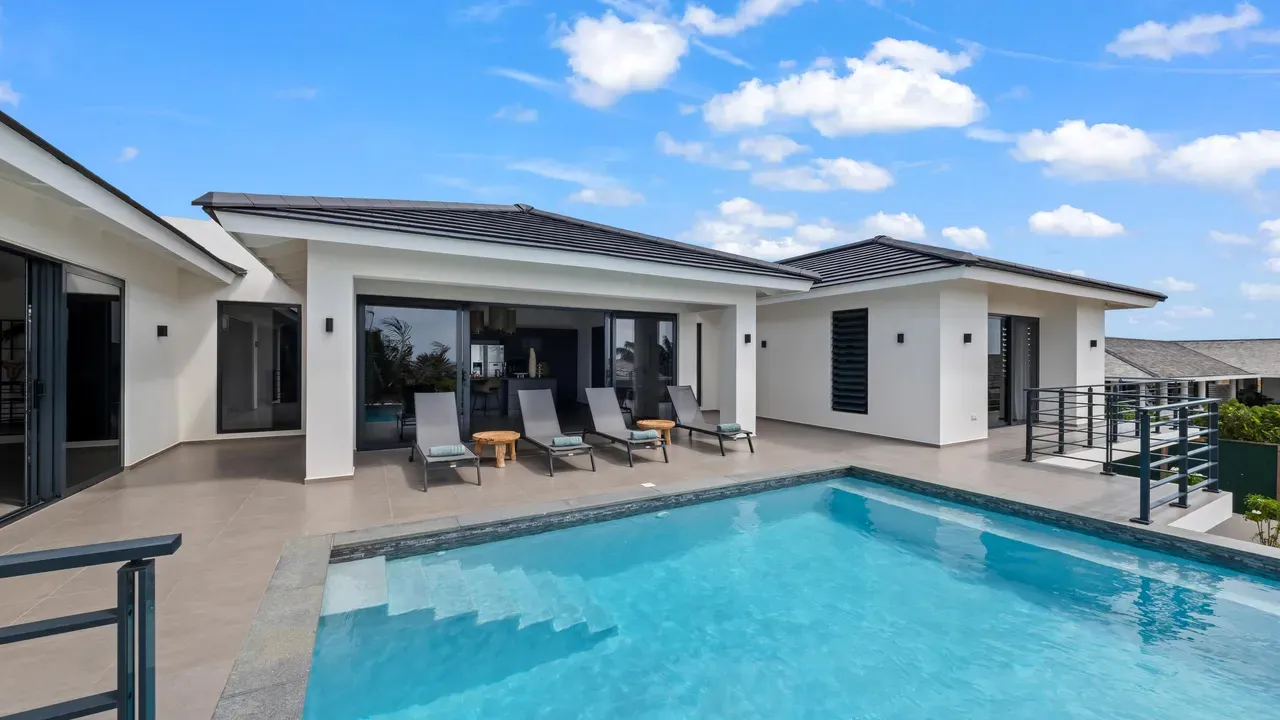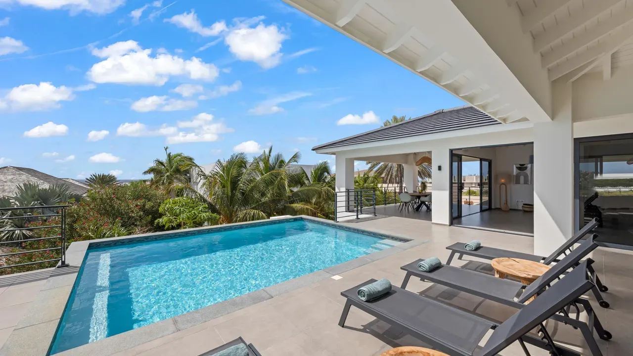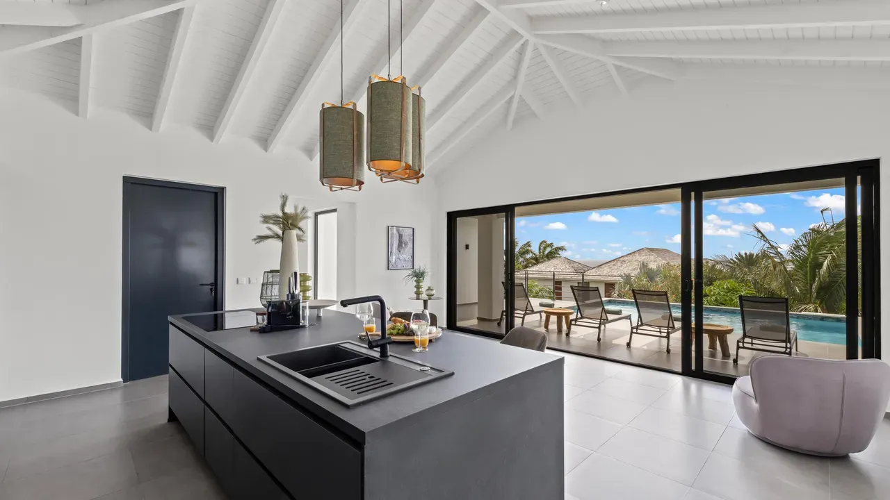 With exceptional precision and an impeccable sense of aesthetics, this villa in Vista Royal is celebrated as one of the most exquisitely designed masterpieces of today. The residence offers breathtaking views over the Caribbean Sea and the iconic Jan Thiel skyline. With this architectural triumph, Colombian architect Diego Hanao once again showcases his unparalleled signature style. Nestled along a quiet, distinguished street, the villa is crafted with materials of the highest caliber and adorned with bespoke finishes. The impressive tropical hardwood roof structure and expansive glass sliding doors bathe the interiors in natural light, creating an airy ambiance that seamlessly merges indoor and outdoor living. The villa features four bedrooms, including a lavish master suite, each accompanied by a luxuriously appointed en-suite bathroom and generous walk-in closets. The open floor plan flows effortlessly through the home's three primary spaces: the living area, the elegant gourmet kitchen, and the exclusive master suite. This harmonious layout is further enhanced by a grand chef’s kitchen equipped with premium appliances, a stunning infinity pool, an expansive entertainment area, a two-car indoor garage, and atmospheric LED lighting that beautifully accentuates the custom-designed balustrades. The garden has been designed and landscaped with meticulous care, forming a serene, lush oasis where exotic plantings and stately palms thrive in perfect harmony. Supported by an advanced automatic irrigation system, this verdant sanctuary remains in pristine condition throughout the year. This extraordinary villa has been conceived for the most discerning buyer—a rare fusion of design, craftsmanship, and location. We look forward to personally presenting this exceptional residential experience to you.