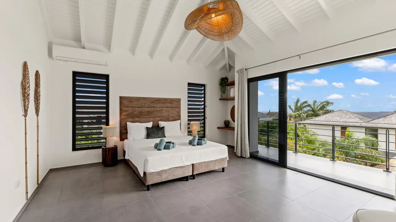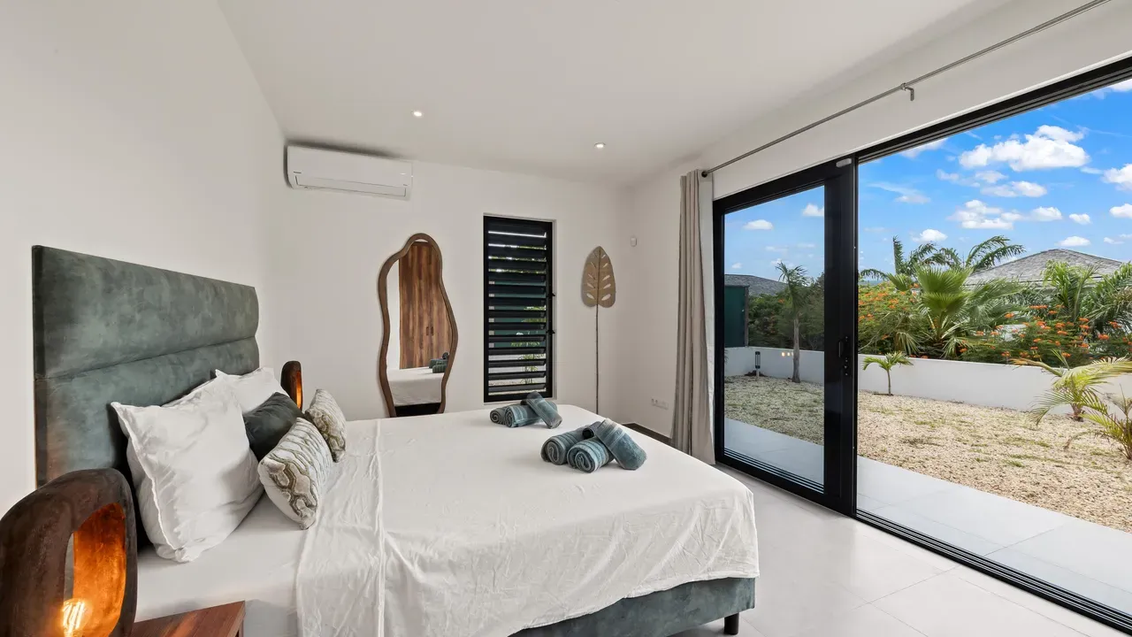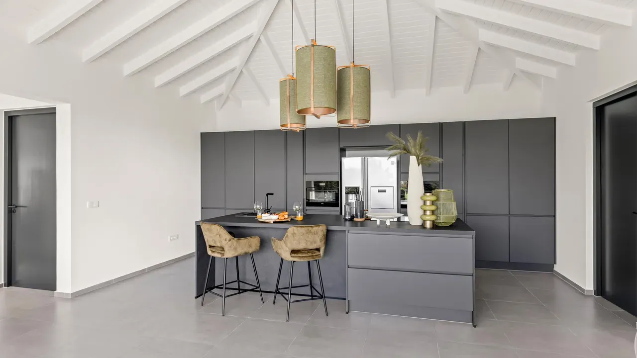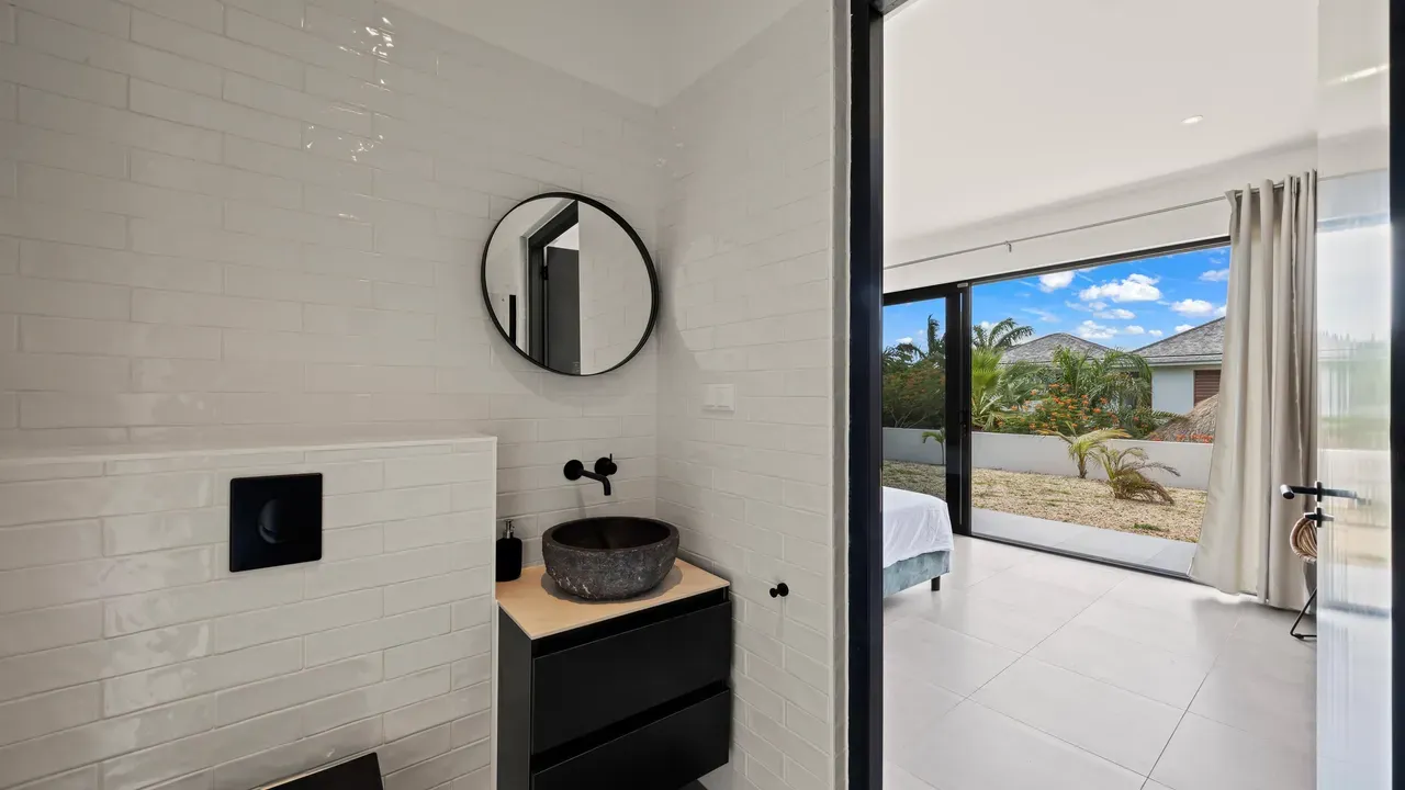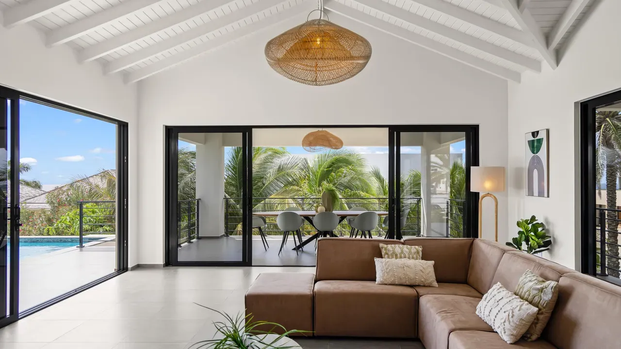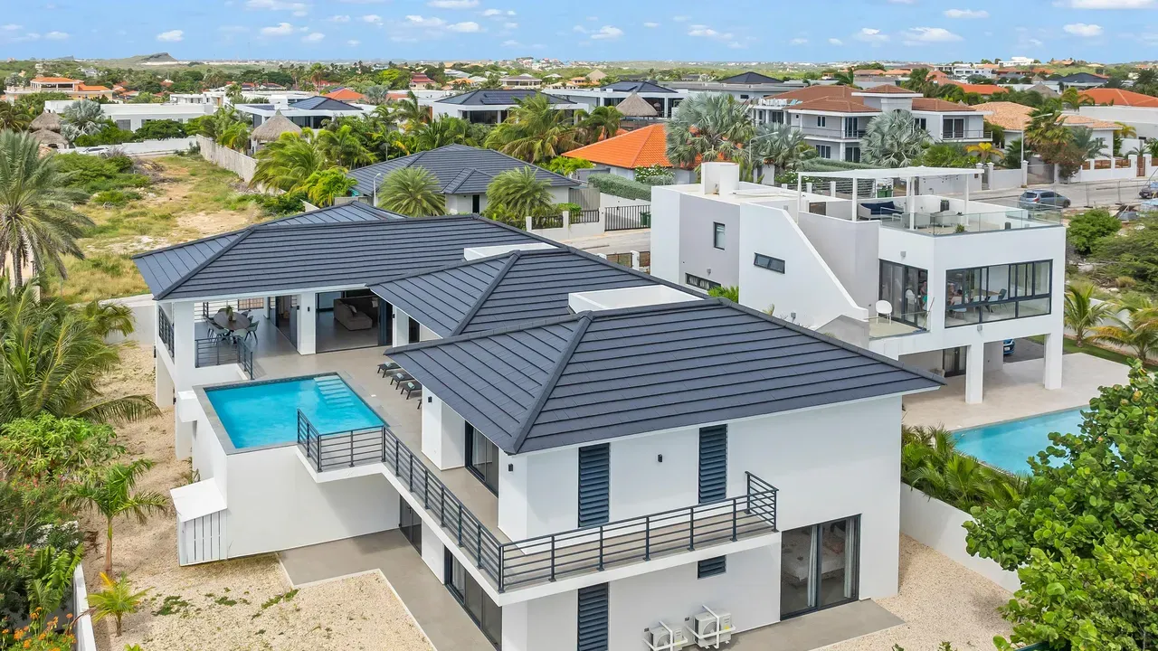 With exceptional precision and an impeccable sense of aesthetics, this villa in Vista Royal is celebrated as one of the most exquisitely designed masterpieces of today. The residence offers breathtaking views over the Caribbean Sea and the iconic Jan Thiel skyline. With this architectural triumph, Colombian architect Diego Hanao once again showcases his unparalleled signature style. Nestled along a quiet, distinguished street, the villa is crafted with materials of the highest caliber and adorned with bespoke finishes. The impressive tropical hardwood roof structure and expansive glass sliding doors bathe the interiors in natural light, creating an airy ambiance that seamlessly merges indoor and outdoor living. The villa features four bedrooms, including a lavish master suite, each accompanied by a luxuriously appointed en-suite bathroom and generous walk-in closets. The open floor plan flows effortlessly through the home's three primary spaces: the living area, the elegant gourmet kitchen, and the exclusive master suite. This harmonious layout is further enhanced by a grand chef’s kitchen equipped with premium appliances, a stunning infinity pool, an expansive entertainment area, a two-car indoor garage, and atmospheric LED lighting that beautifully accentuates the custom-designed balustrades. The garden has been designed and landscaped with meticulous care, forming a serene, lush oasis where exotic plantings and stately palms thrive in perfect harmony. Supported by an advanced automatic irrigation system, this verdant sanctuary remains in pristine condition throughout the year. This extraordinary villa has been conceived for the most discerning buyer—a rare fusion of design, craftsmanship, and location. We look forward to personally presenting this exceptional residential experience to you.